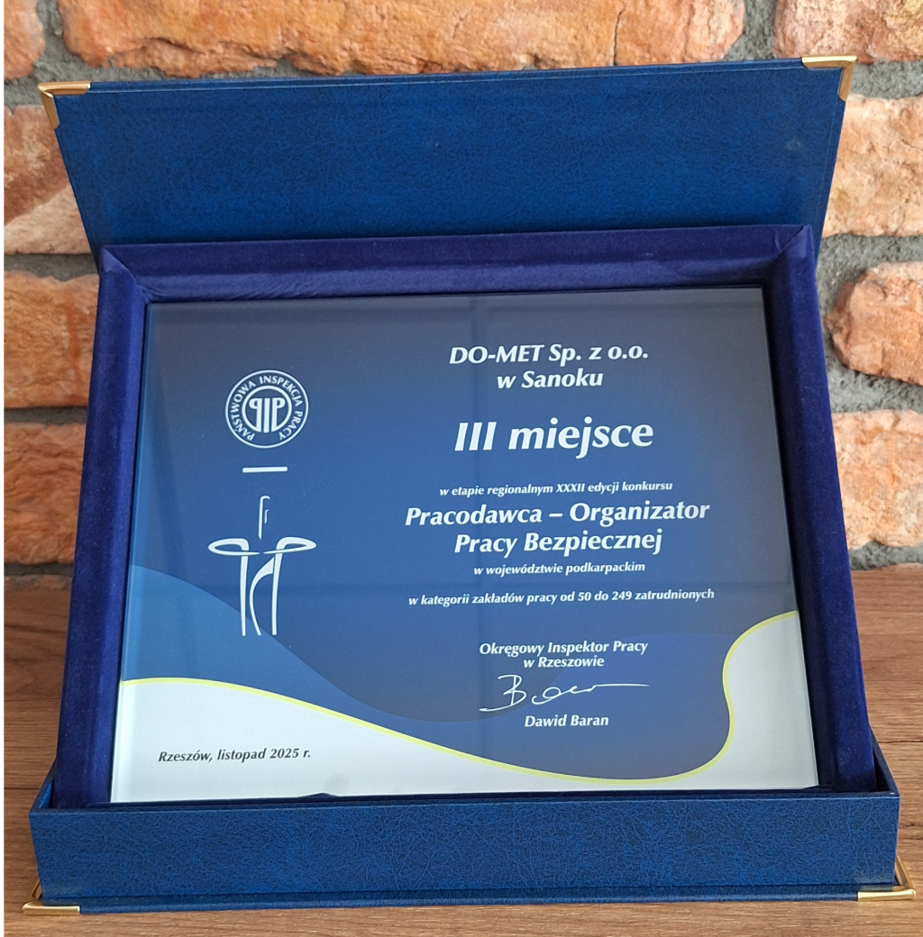 Z przyjemnością informujemy, że firma DO-MET zdobyła III miejsce w prestiżowym konkursie „Pracodawca – Organizator Pracy Bezpiecznej”, organizowanym przez Państwową Inspekcję Pracy oraz Okręgowy Inspektorat Pracy w Rzeszowie. Wyróżnienie przyznano w kategorii pracodawców zatrudniających od 50 do 249 pracowników.
